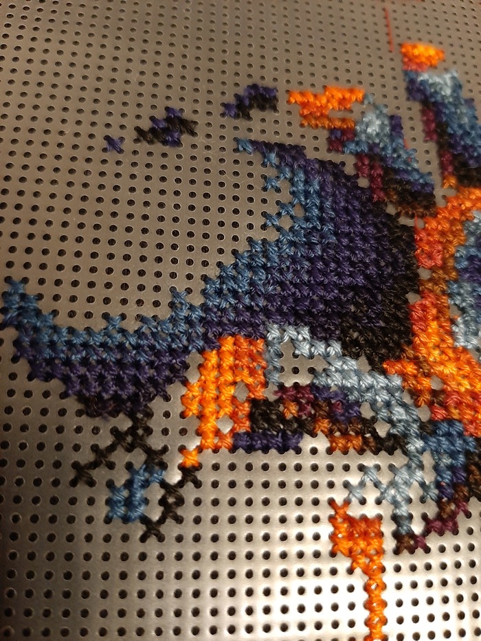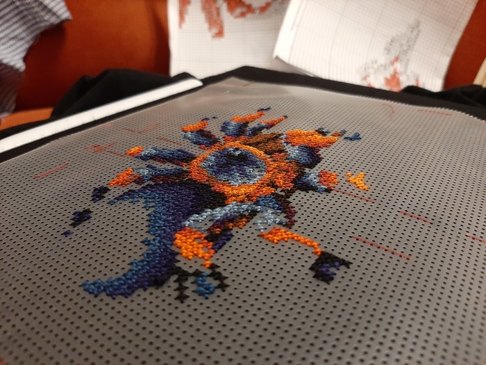 Вышивка крестиком, нитки DMC, водорастворимая канва, майка качеством так себе. Автор схемы: saverastitch, можно найти вк. Схему я немного меняла по ходу процесса, она мне показалась неоправданно сложной.