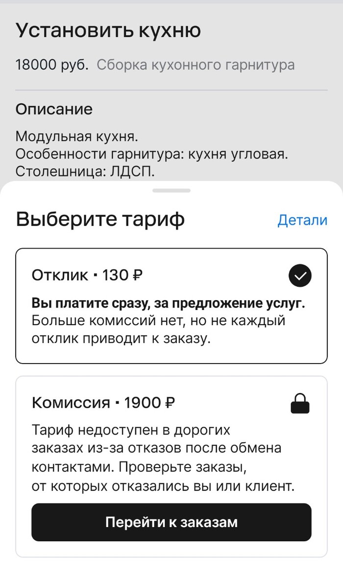 Да, если отклик не посмотрят, деньги вернут. А если посмотрит то нет. А я напомню, там может быть тупо скучающая домохозяйка, которой интересны цены, а кухни у нее ещё даже нет. Комиссия выглядит интереснее, но и тут не все гладко. Если берешь несколько контактов за комиссию, будут наложены ограничения, пока или не заплатишь или не докажешь что сделка не состоялась. По этому если хочешь работать, будешь платить, платить, платить. Да, суммы не большие. 50-100-200₽. Но они ничего не гарантируют. И ты тратишь деньги, время, постоянно мониторишь сервис на наличие заказов, а в итоге в лучшем случае один-два адекватных заказа в месяц, а то и меньше. Так что ну его на фиг. Мне и так работы хватает. Пойду очередную кухню монтировать.