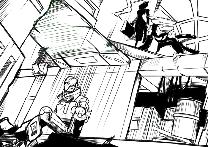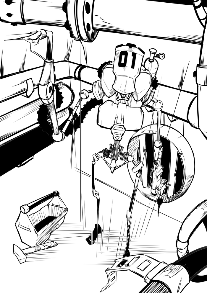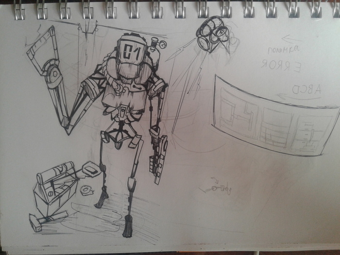 Изгачально это должен был юыть солдат в экзоскелете, с таким же ракурсом, сверху-вниз, но потом он как-то превратился в карикатурного робота-ремонтника.