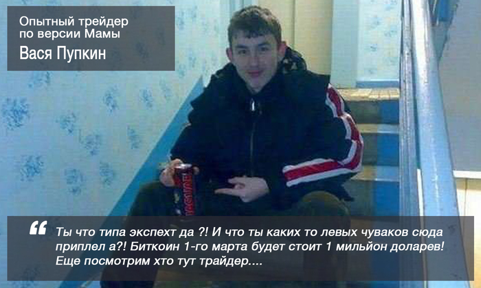 Был у меня такой знакомый Вася (имя изменено), которого я знал со студенчества и который за все время моего знакомства искал "легких" путей заработать деньжат. к слову сказать, у Васи было экономическое образование. Короче осенью 2017 года этот Вася конкретно так проникся идеями блокчейна (прям как нахуй сектант) и изрядно стал доёбывать меня разговорами о вложении в биткоин, поднятии бабла и что пора валить из рашки. На все мои возражения этот дятел ссылался на авторитетных людей с достаточно известного сервиса инвестинг(сукаматьего)ком, которые ведут там дискуссии в комментариях на паре BTC USD. И вот Вася пообщавшись вдоволь с гуру экспертами по криптовалютам, продав свою ниссан-хуисан и заняв денег у всех кого только смог, вкладывается в это криптодерьмо в начале декабря 2017-го на сумму 40 штук зелени.