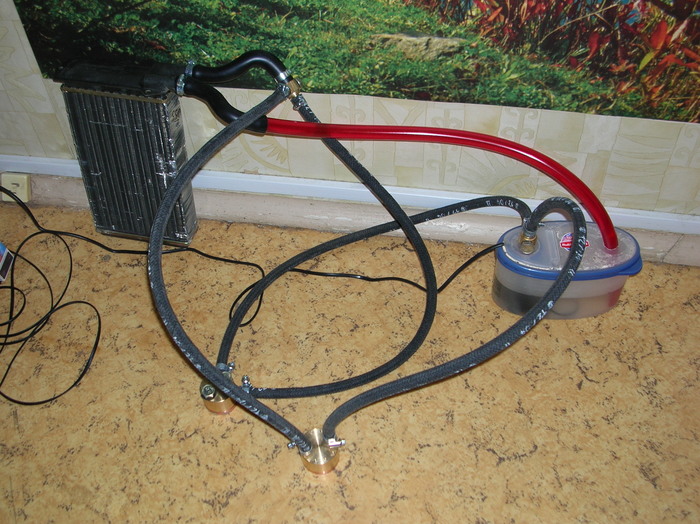 В крайней ограниченности мат. средств, после раздумий было принято решение - будем играть в автомобильную тему. Я в то время и так "развлекался! со своим авто (Таврия). Так что радиатор взял от нее (потом еще и много другого). Пришло время, утерев слюни ожидания сопли сомнения, создаем контур для будущей системы. Выглядел сей первый колхоз так...