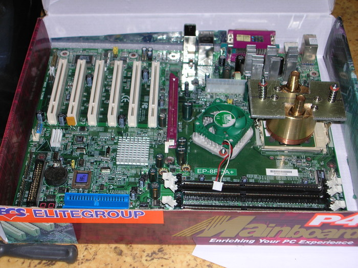 Красота, Да? Справа от процессора стоят приклеенные на термоклей обрезки радиатора старого кулера. Сами должны понимать, раз нет теперь обдува штатного ветряного кулера, то Мосфеты процессора будут греться еще сильнее. Тем более, когда проц будут разгонять по всем хвостам.