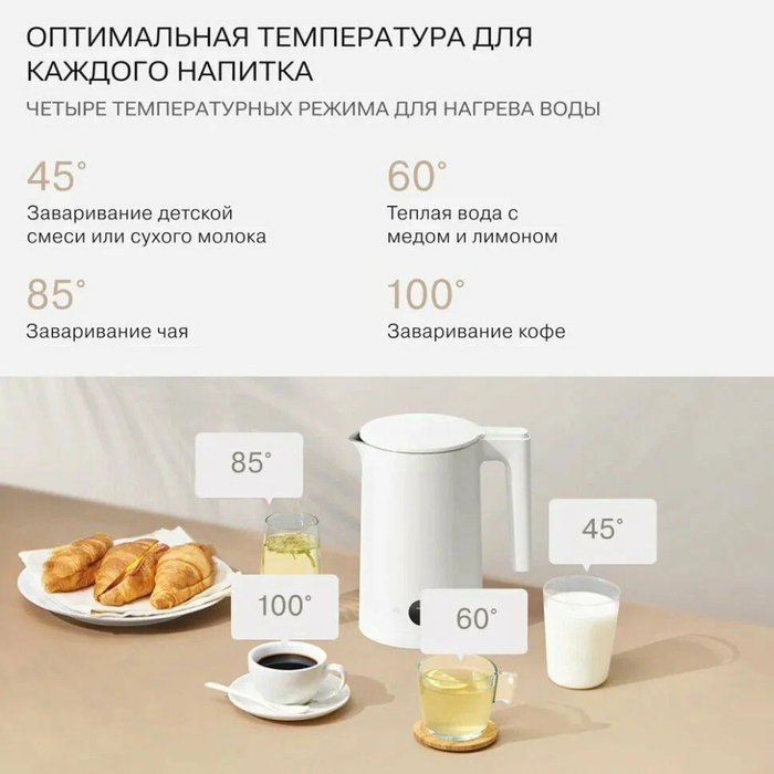 Чайник имеет несколько режимов нагрева для разных видов напитков, а также функцию поддержания заданной температуры. Объём 1,5 литра оптимален для семьи из 3-4 человек. Встроенный дисплей показывает текущую температуру воды в реальном времени. Благодаря защите от включения без воды и автоматическому отключению, устройство безопасно в повседневном использовании.