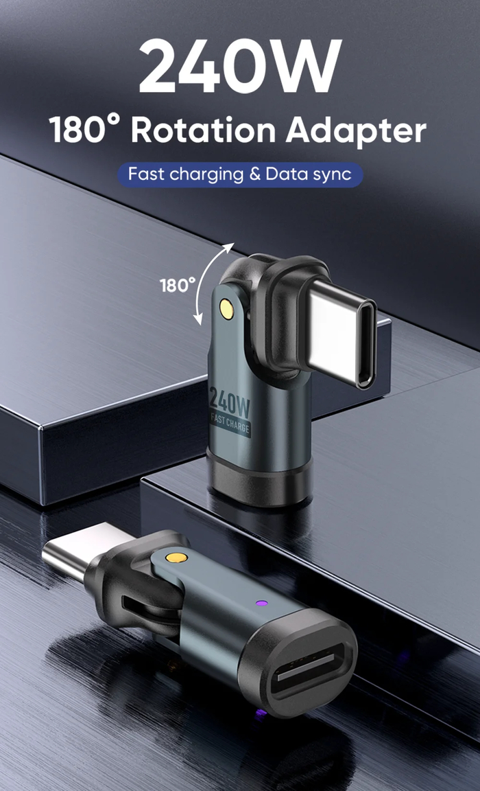 Адаптер с поворотным механизмом на 180° для зарядки и передачи данных. Поддерживает мощность до 240 Вт и скорость передачи данных до 40 Гбит/с, что соответствует стандарту USB 4.0.