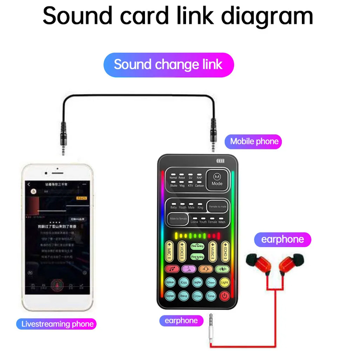 Модификатор голоса совместим с мобильными телефонами, компьютерами и планшетами через стандартный 3,5 мм разъем. Встроенный аккумулятор на 500 мАч обеспечивает 3-4 часа работы. Устройство поддерживает одновременное подключение к трем устройствам и имеет полный набор функций для настройки прямых трансляций.