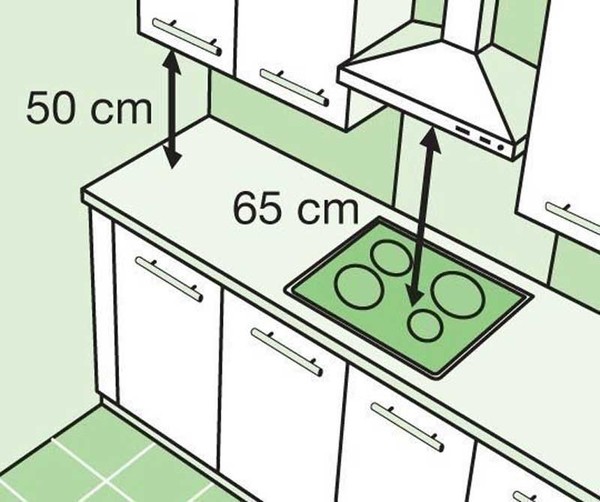 Навесные шкафы устанавливайте на минимальном расстоянии от 50 до 70 см от рабочей поверхности. Вытяжку рекомендуется устанавливать на расстоянии 65 см (для электроплит), 75 см (для газовых плит) для хорошей циркуляции воздуха и быстрого исчезновения дыма.