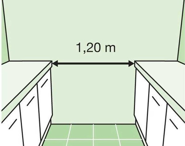 В случае параллельного типа кухни, оставьте минимальное пространство 1 м 20 см, чтобы иметь возможность доступа к различным предметам и к мебели, а также для свободного перемещения.