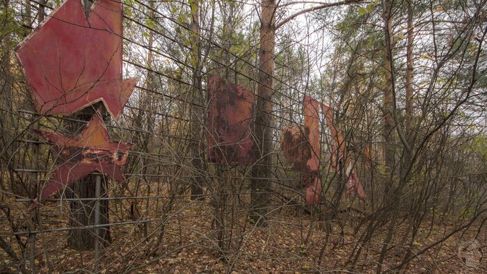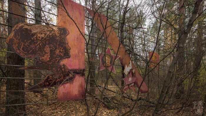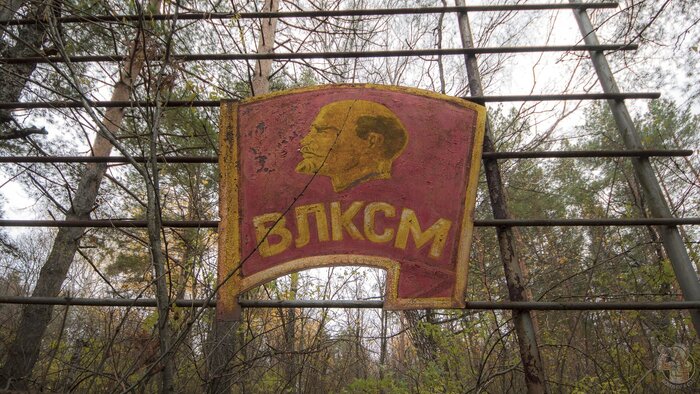 Был на территории лагеря и красный уголок. Яркая красная советская символика давно заржавела, а бюст Ленина кто-то поставил на землю.