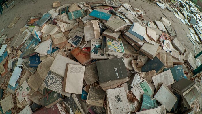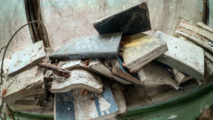 ...правда в таком состоянии, как здесь их даже причинным местом не почитать. Даже на растопку не сгодятся. Отсырели, заплесневели и слиплись, словно забытые на десятилетие пельмени. Книжки, жалко, но здесь и уже не спасти.