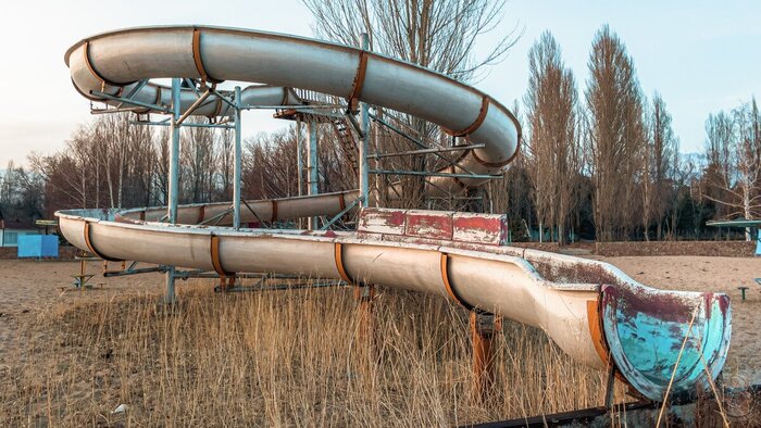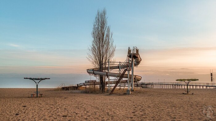 Тем не менее она по-прежнему остаётся своеобразной «архитектурной доминантой пляжа» и несомненно привлекает внимание. Обратите внимание, что она заброшена так давно, что между изгибов жёлоба успело вырасти высоченное дерево!