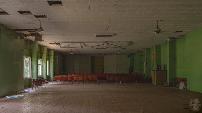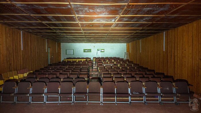 Клуб встречает пыльным сумраком просторного зрительского зала. Стулья обращены к сцене, на противоположной стороне можно заметить окошки для кинопроекторов.