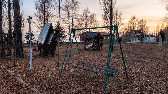 Кресла качели, щиты с олимпийскими мотивами, деревянные теремки на детской площадке — всё это напоминает о давно ушедшей эпохе.