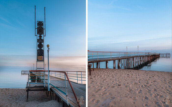 Меня охватывает ностальгия по прошлым временам, когда на этом пирсе гуляли люди в белых купальниках и радостно купались в прозрачной воде озера. Сейчас же это место кажется забытым и ушедшим в прошлое, но тем не менее оно до сей поры сохраняет свою уникальную атмосферу. Я осторожно приближаюсь к краю пирса, смотрю на воду и понимаю, что не смогу себе позволить нырнуть в прохладную воду, как это делали отдыхающие здесь десятилетия назад. Сейчас воды стало намного меньше, что наглядно демонстрируют лестницы в воду.