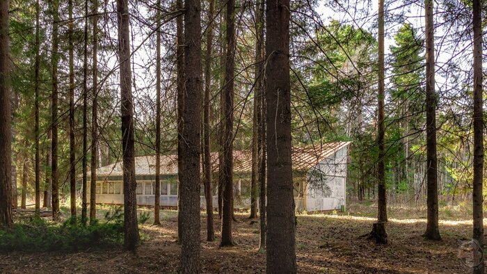 Дальше двигаемся в лагерный клуб. Это неприметное здание с большими окнами, в которых отражается зелёная стена соснового леса.