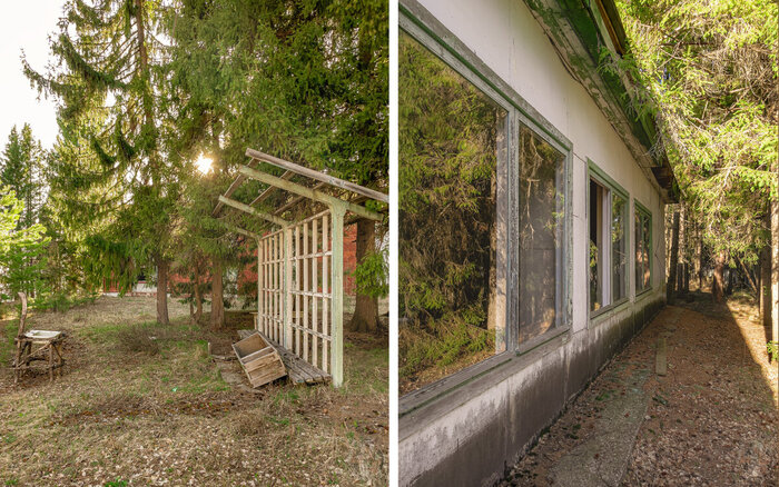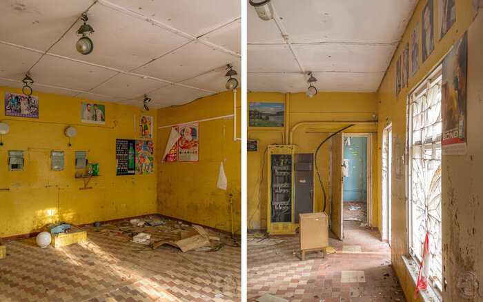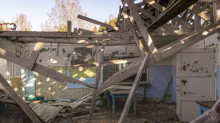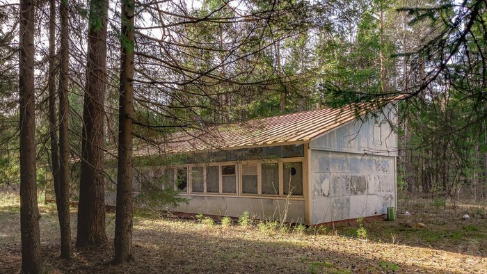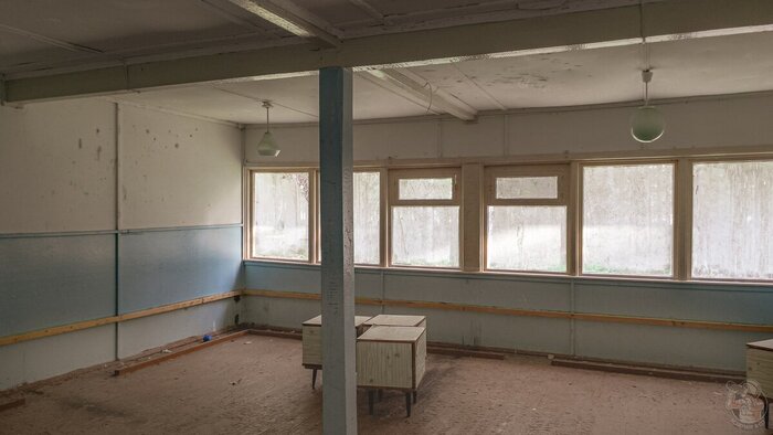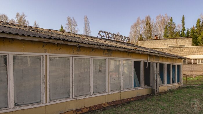 Следующим зданием на нашем пути была столовая. Её состояние также не оставляло сомнений в том, что она заброшена. Стёкла разбиты, крыша обвалилась, а двери открыты нараспашку.