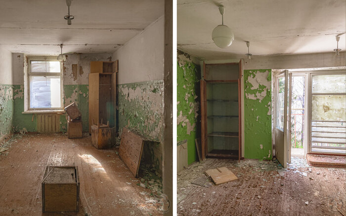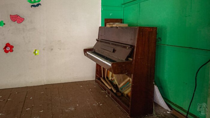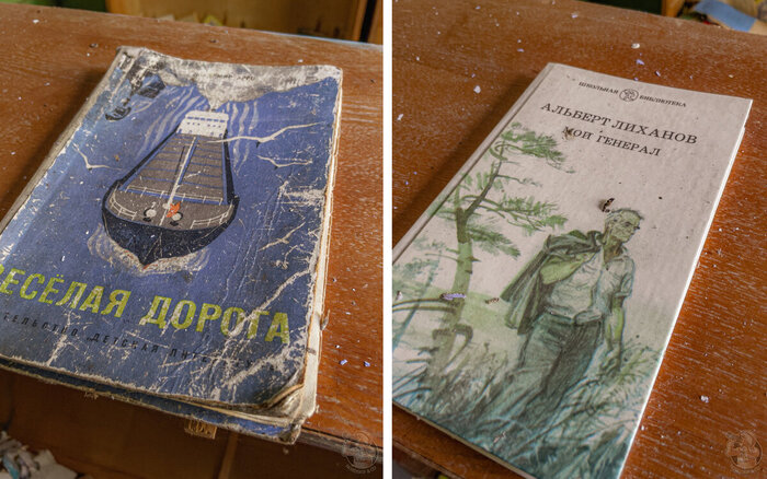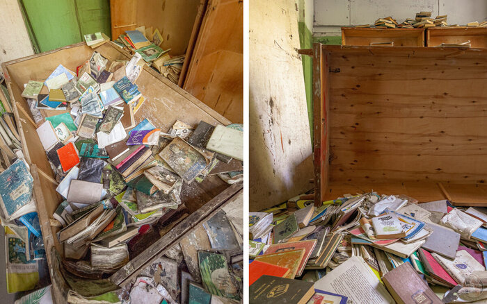 Завершаем прогулку в небольшой библиотеке, с парой сотен детских книжек сваленных в кучу. Шкафы прогнили и упали. То ли сами не выдержали веса, то ли им кто-то помог. Впрочем, какая теперь разница?