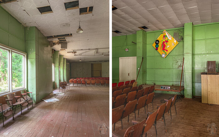 Внутри кирпичного АБК размещались кабинеты, склады, раздевалки, а также небольшой актовый зал руины, которого вы можете видеть на фотографии ниже.