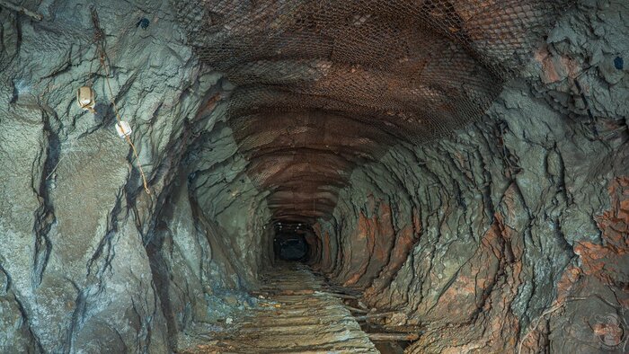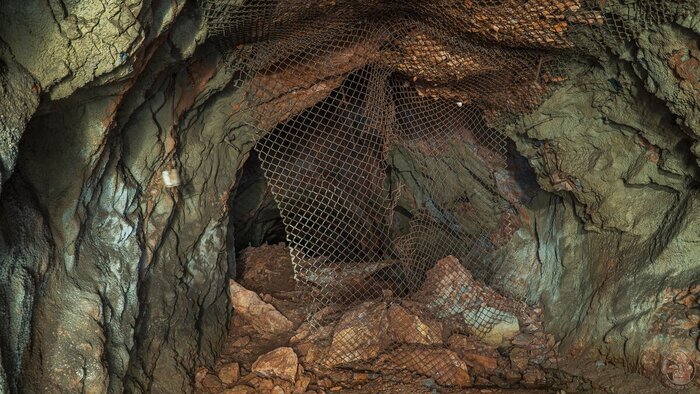Своды укреплены защитной сеткой, с потолка свисают остатки троллея, под которым догнивают остатки шпал. По всем признакам, ходок предназначен для транспортировки руды от другой крупной выработки ближе к ГОК.