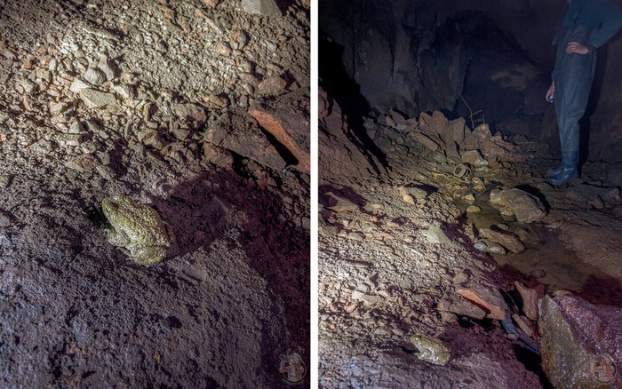 Других входов в этот участок системы — нет. После крайне щекотливого участка штольня заканчивается обвалом, а стало быть, лягушка пришла с поверхности, а это почти полкилометра от входа.