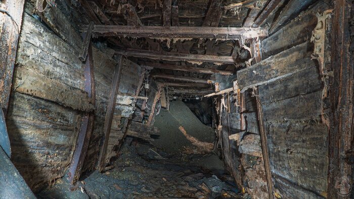 Завершаю нашу подземную экскурсию хочу в необорудованной части рудника, где подземный лес деревянной крепи активно подъедают волны белой плесени.