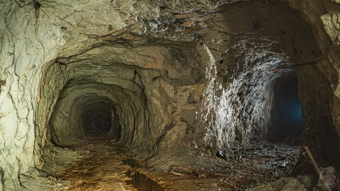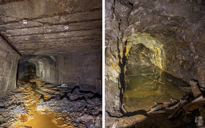 Первые пара сотен метров выработки сильно обводнены. На входе, пахнет сероводородом. Наблюдаем у воды небольшое превышение H2S, далее газоанализатор показывает нормальные значения.