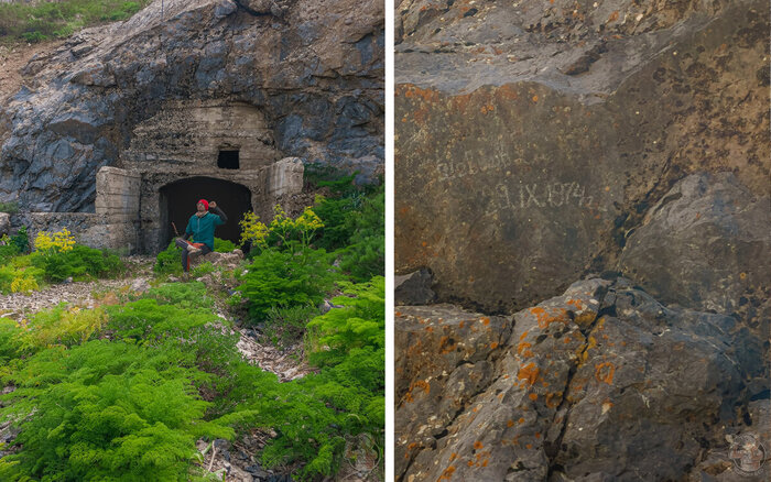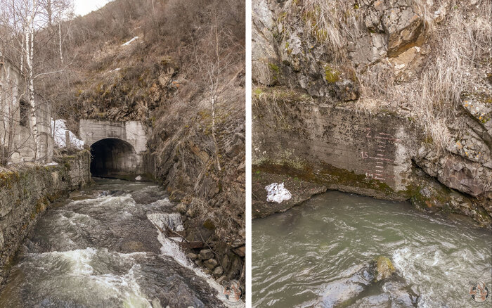 Но вот мы у входа. Выработка встречает нас капитальным бетонным порталом и надписью, нацарапанной на камне полвека назад. Ну, что же включаем фонари. газоанализатор, дозиметр и двигаемся вглубь горы.