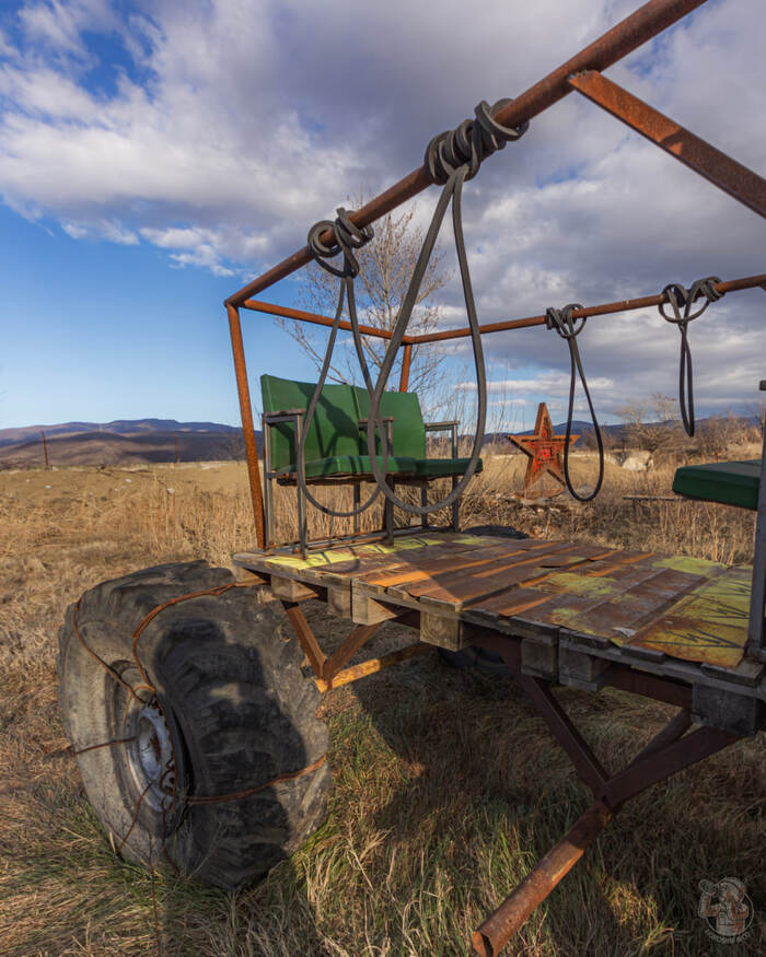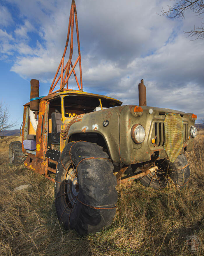 Поднявшись на пригорок, мы увидели ещё одну стоянку ржавой шахтной техники. Смотрелась она исключительно живописно!