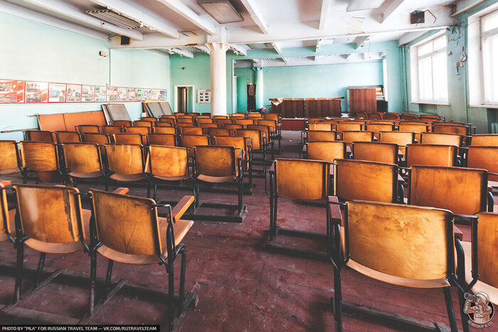 Внутри кирпичного АБК размещались кабинеты, склады, раздевалки, а также небольшой актовый зал руины, которого вы можете видеть на фотографии ниже.