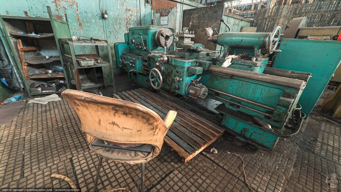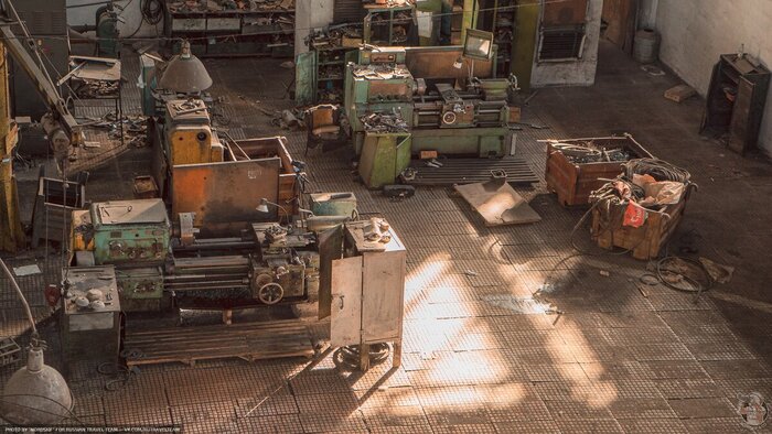 Опустевшие рабочие места выглядят так, словно заводчане ушли на обед и вот-вот вернутся. Да только металлическая пыль, которую раньше гоняли по цеху промышленные вентиляторы осела на всех поверхностях и теперь, решившему посидеть у станка придётся выкинуть одежду.