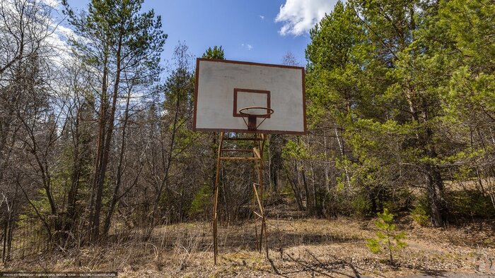 Первое, что попадается на глаза это беседка с выцветшими от времени досками и заросшая спортивная площадка с кольцом для баскетбола.