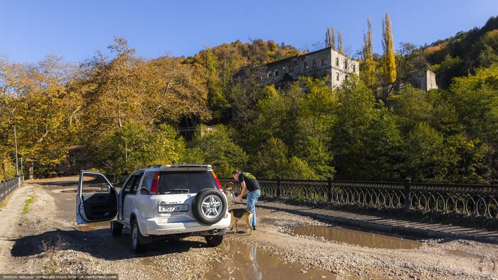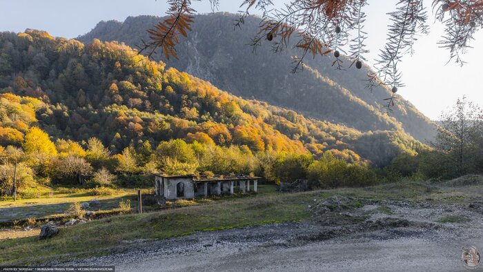 Как говорится — всё познаётся в сравнении. Осень на горные склоны вдоль реки Галидзгу приходит поздно и даже в середине ноября, листва только начинает разгораться «золотом». Погода прекрасная и снежные шапки далёких гор даже не думают спускаться ниже, чтобы укрыть белым полотном самый депрессивный район Абхазии.