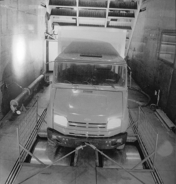 Для таких испытаний нужна огромная агрегатина. Ведь испытания проводятся на огромных автомобилях. Посмотрите, как ничтожно и мелко выглядит человек в масштабах с этой махиной!