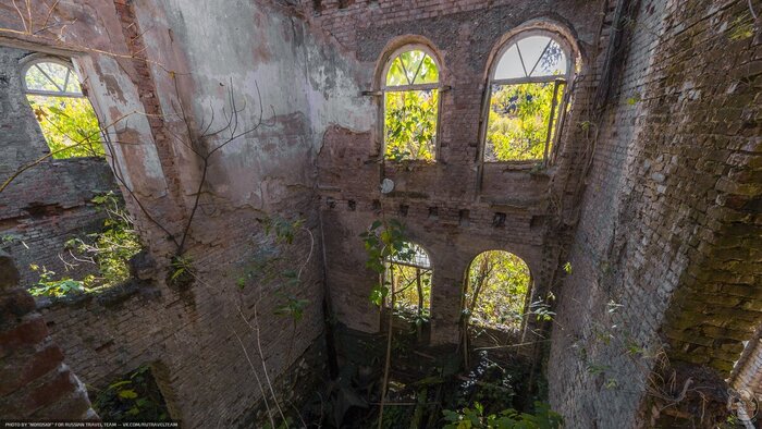 Руины столовой. Если бы не металлические столбы-опоры я бы принял здание за советское, но такая конструкция характерна для построек дореволюционного периода. Удивительно, но даже в таком состоянии заметно, насколько уютной когда-то был местный обеденный зал.