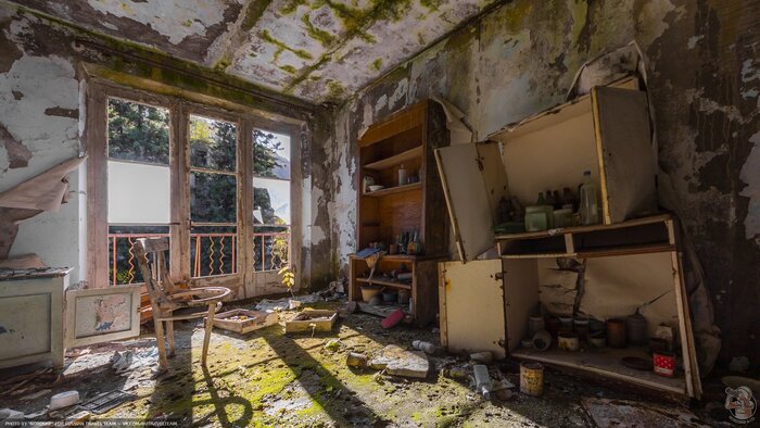 Оконные проёмы чернеют провалами, стёкла выбиты, а лестницы и дороги покрыты толстым слоем мягкого и вечно мокрого мха.
