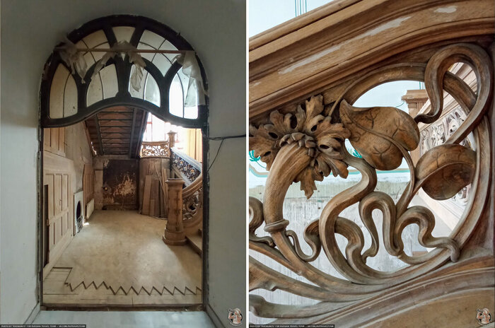 хорошо сохранившиеся камины, деревянные рамы и кованые лестничные перила — ещё один признак стиля модерн)