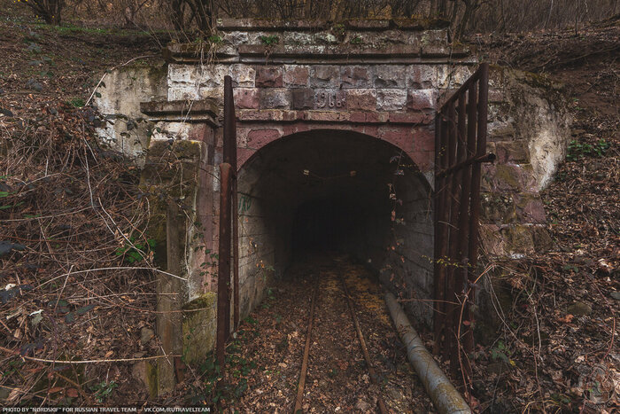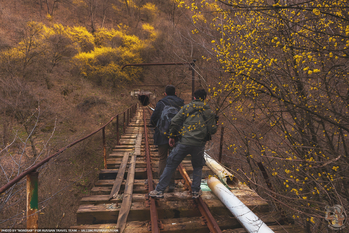 Начинаем мы наш поход со старого, обветшавшего железнодорожного моста, рельсы которого почти сразу же скрываются в темных недрах горы.