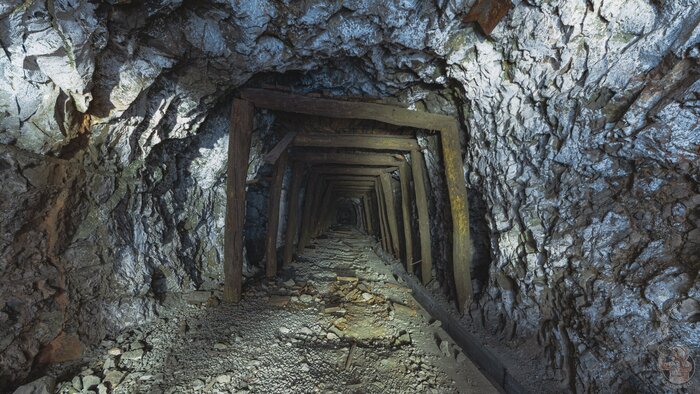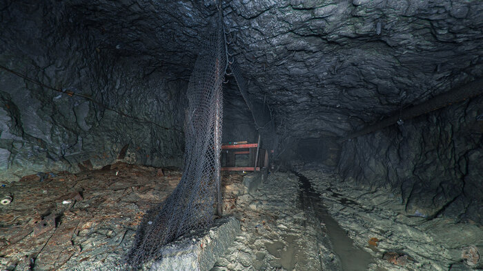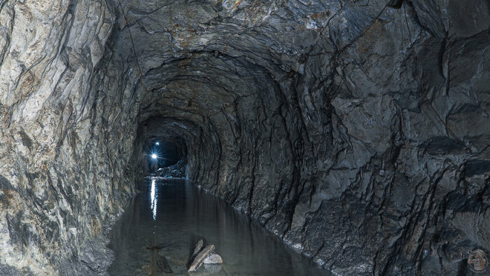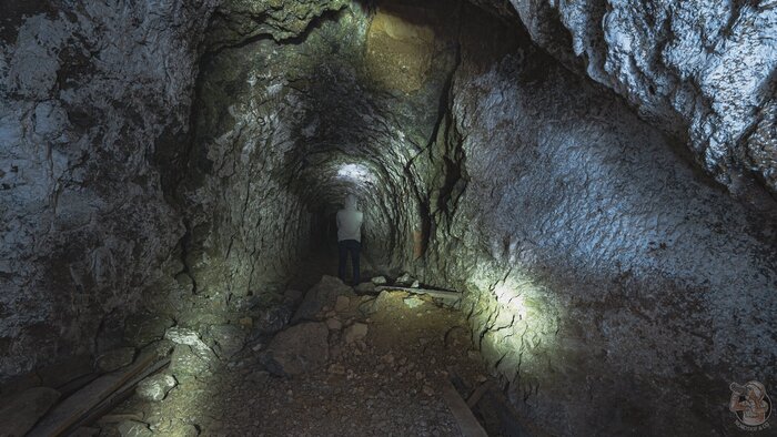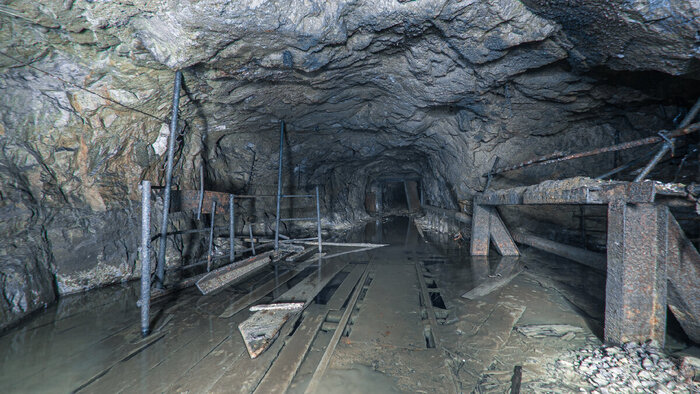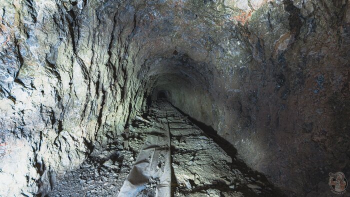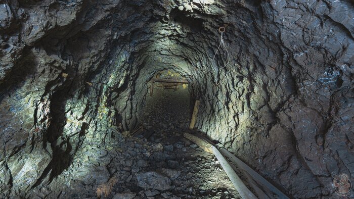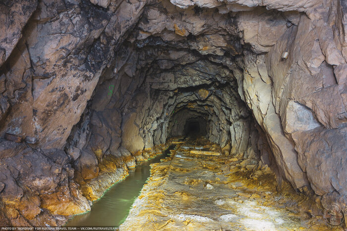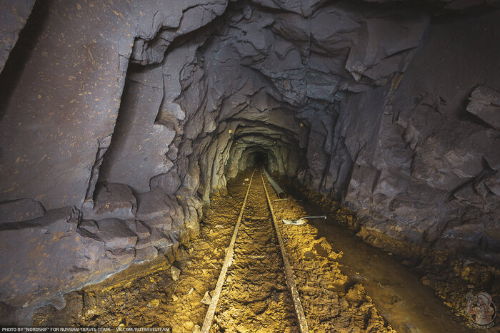 В самом начале первого тоннеля мы видим бетонный короб, но дальше нас ждут лишь голые скалы, рельсы и густая ржавая жижа, которая может поглотить наши ботинки.