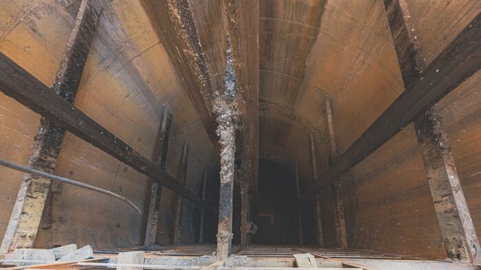 Окрашенные в коричневый цвет стены на самом деле ничто иное, как следы ржавчины. Это заброшенное убежище некоторое время стояло затопленным, и ржавые воды остались «краской» на его стенах…