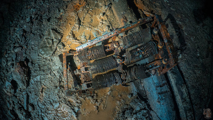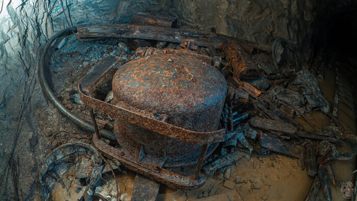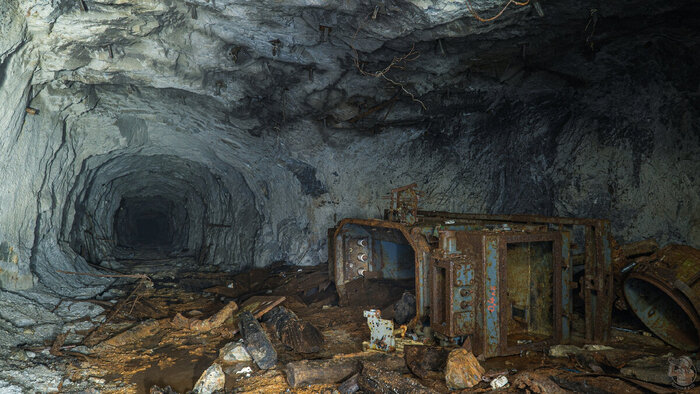 Так произошло и здесь. Исследуя отдаленную часть рудника мы чуть было не прошли мимо неприметного провала — пробитой в бетонном полы дыре. В темноте нижнего яруса просматривалась целая вагонетка и мы решили туда спустится. Порой, горняки "прятали" особо важные участки выработок перед самым закрытием шахты или рудника. Обычно засыпался вход, но иногда и отдельные участки системы, с целью уберечь оборудования от рук мародёров.