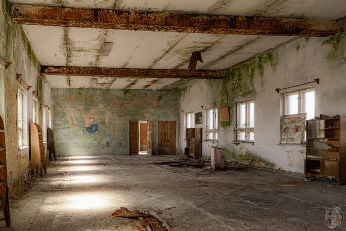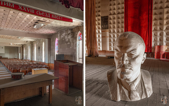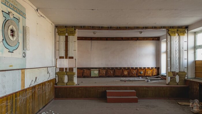 Огромный актовый зал сохранился практически идеально, где ещё такое встретишь? Конечно, годы запустения, мародёры и протекающая крыша не прошли для него совсем уж бесследно и всё же, постоянные читатели нашего канала знают, что обычно подобные места выглядят гораздо, гораздо хуже!
