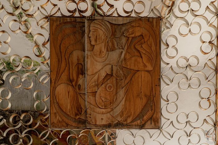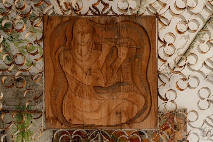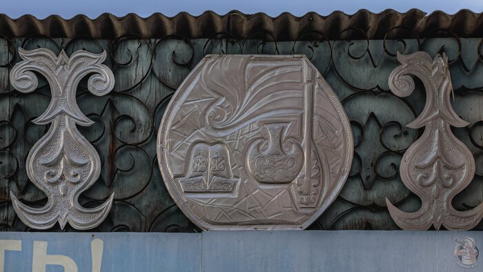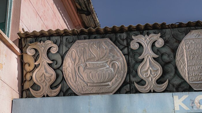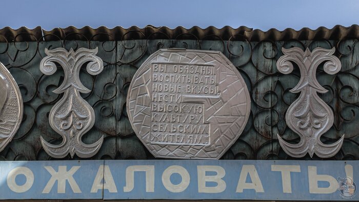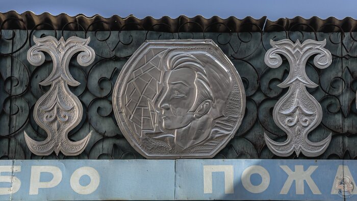Завершаем осмотр здания подробными снимками чеканки над входом в здание. Таким изящным и недорогим способом украшали типовые советские проекты в условиях ограниченного бюджета, и, к сожалению, зачастую в подобных архитектурных элементах культурной ценности не видят, и они пропадают в ходе первой крупной реконструкции.