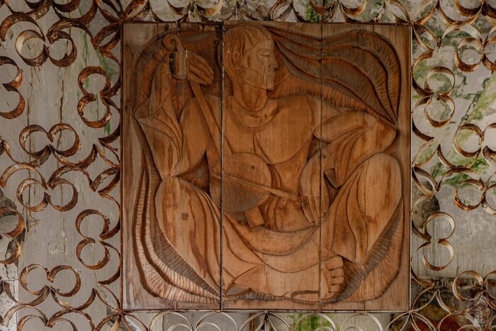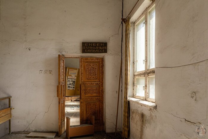 Огромную, светлую, но пахнущую плесенью и мокрой штукатуркой комнату украшают резные деревянные панно и ковёр! Вот уж действительно завод с региональной спецификой... Ещё ни разу, на заброшенных производствах я не видел, чтобы ковром украшали стену. Да ещё таким огромным...