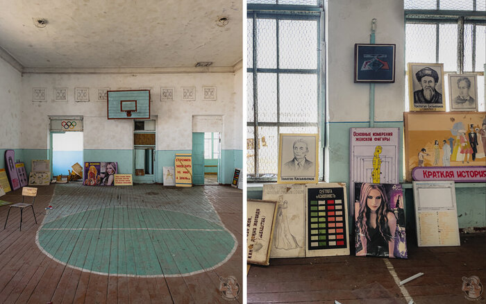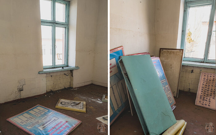 Помещения бывших учебных заведений не балуют разнообразием: в основном учебные классы и кабинеты преподавателей, соединённые узкими коридорами. В дальнем углу здания притаилось фойе главного входа, актовый и спортивный залы, но до них мы доберёмся чуть позже.