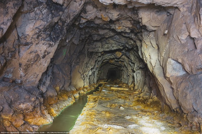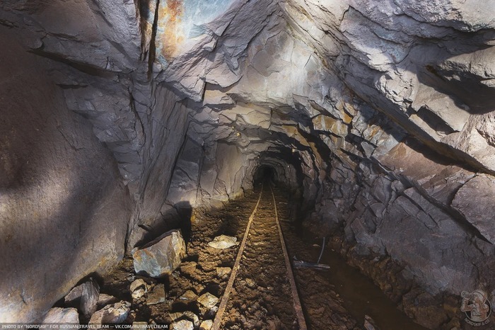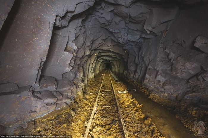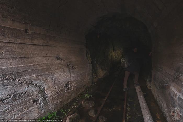 Лишь начало самого первого тоннеля идёт в бетонном коробе — дальше, только голая порода, рельсы и тягучая ржавая жижа, готовая полностью засосать наши ботинки.