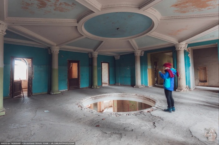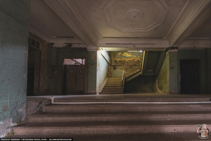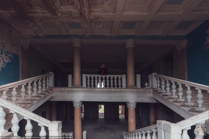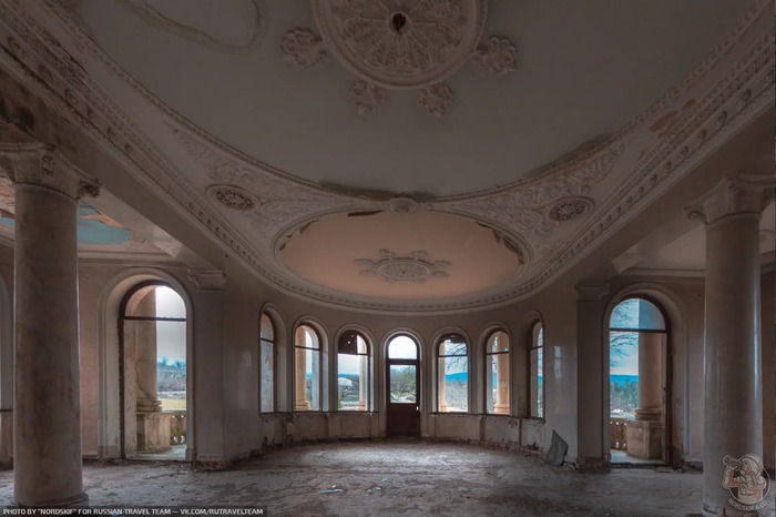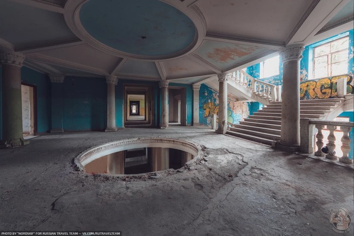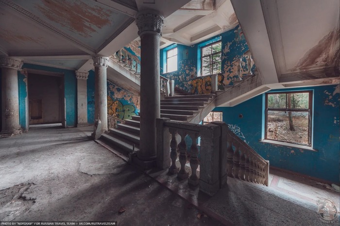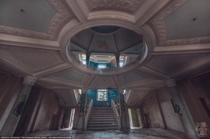 Самая красивая часть заброшенного санатория — актовый зал с колоннами и лепниной. К сожалению люстры, батареи и проводку уже растащили.