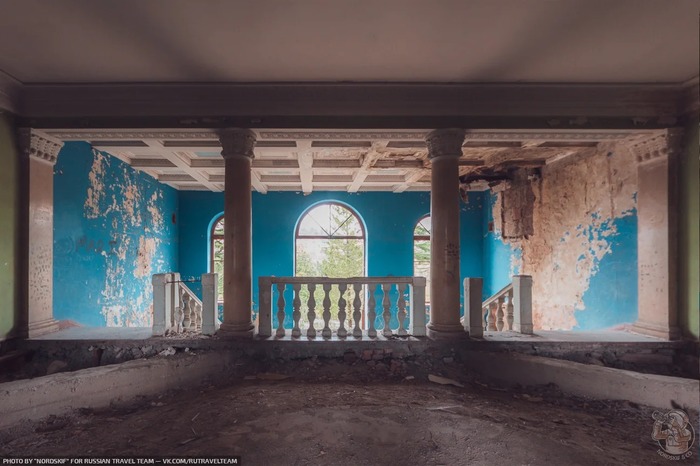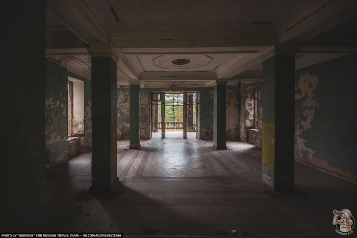 Руины столовой. Если бы не металлические столбы-опоры я бы принял здание за советское, но такая конструкция характерна для построек дореволюционного периода. Удивительно, но даже в таком состоянии заметно, насколько уютной когда-то был местный обеденный зал.