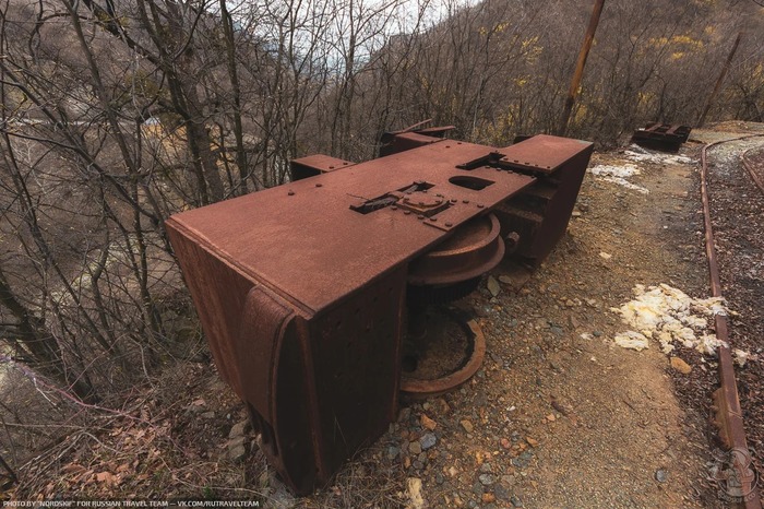 Первый тоннель кончается спустя пару сотню метров и продолжается все той же узкоколейкой, вдоль которой лежат ржавые и заброшенные мотовозы и вагонетки.