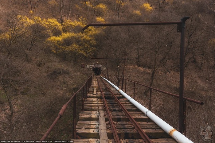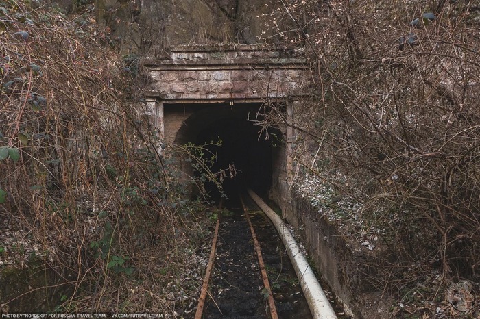 Заброшенная железная дорога продолжает тянуться вдоль склонов, периодически ныряя в горные тоннели.