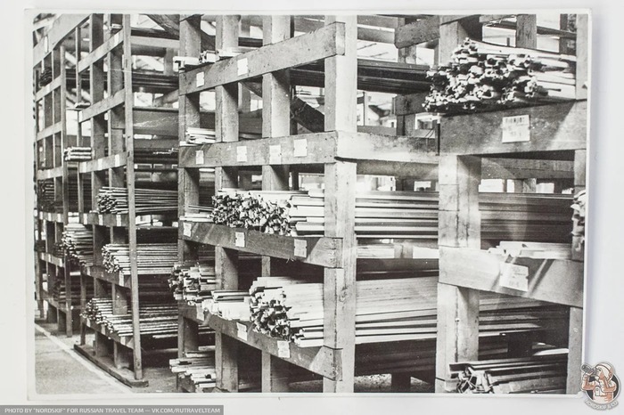 И вот похожий цех (на старой фотографии есть кран балки, но здесь они уже демонтированы), тоже с расчерченным полом, но уже с ящиками стоящими почти "до потолка".