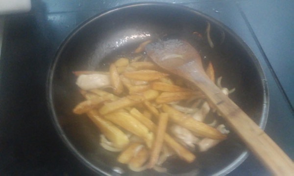 Курицу тоже режем бруском и  кидаем на сковородку